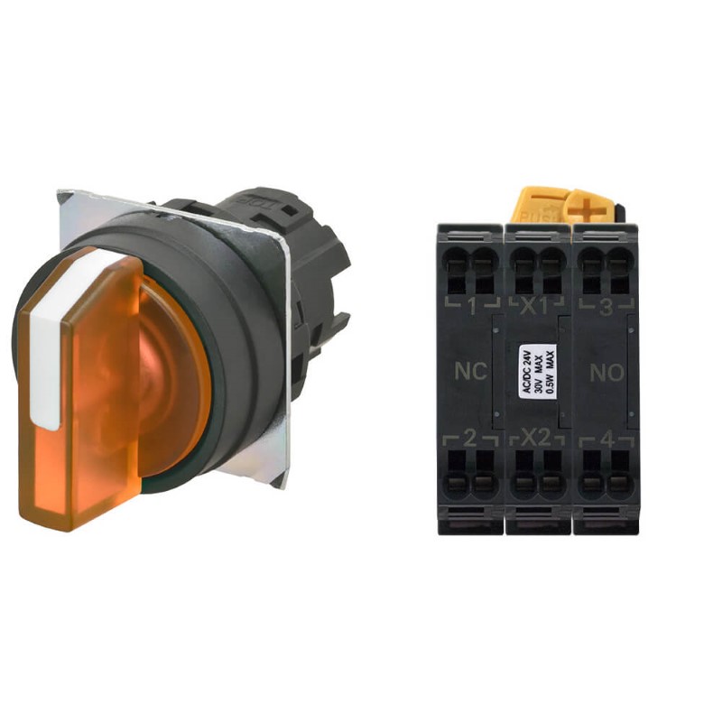 A22NW-3BM-TOA-P102-OC; Selector A22NW Ø22, 3 konum, Işıklı, çerçeve PLASTİK, MANUEL, RENK TURUNCU, LED TURUNCU, 1NO1NC, 24 VDC, push-in terminali