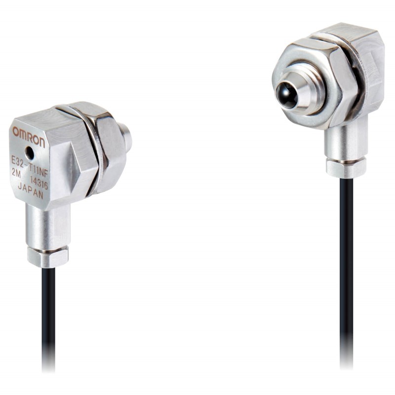 E32-T11NF 2M; Fiber optic sensor head, through-beam, M8 hexagonal back, right-angled head, integrated lens, R1 flexible and oil resistant fiber, 2 m cable
