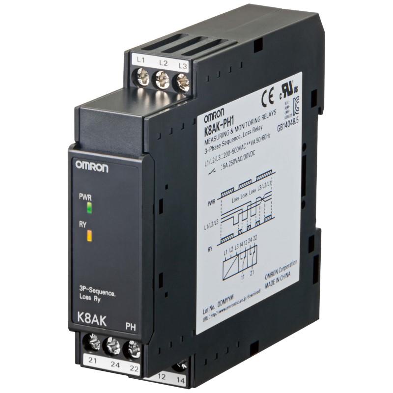 K8AK-PH1; İzleme rölesi 22.5mm genişlik, 3 faz, faz sırası hatası ve faz kaybı, 3 faz 3 kablo, 200-480 VAC, 1 DPDT