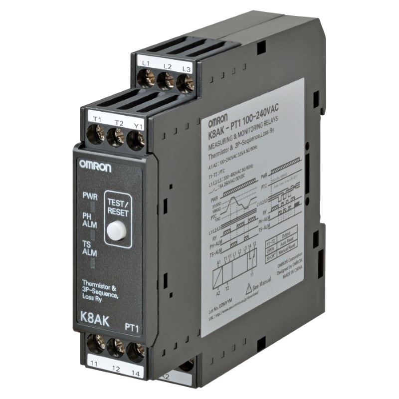 K8AK-PT1 100-240VAC; İzleme rölesi 22.5mm genişlik, 3 faz, faz sırası hatası ve faz kaybı, motor sıcaklık koruması, termistör girişi, 100 – 240 VAC, 1 SPDT