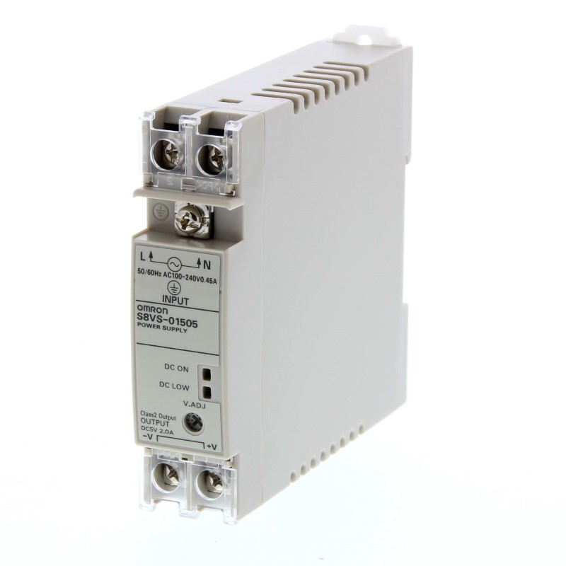 S8VS-01505; Power supply, plastic case, 22.5 mm wide DIN rail or direct panel mounting, 100/240 VAC supply, 10 W, 5 VDC, 2.0 A output