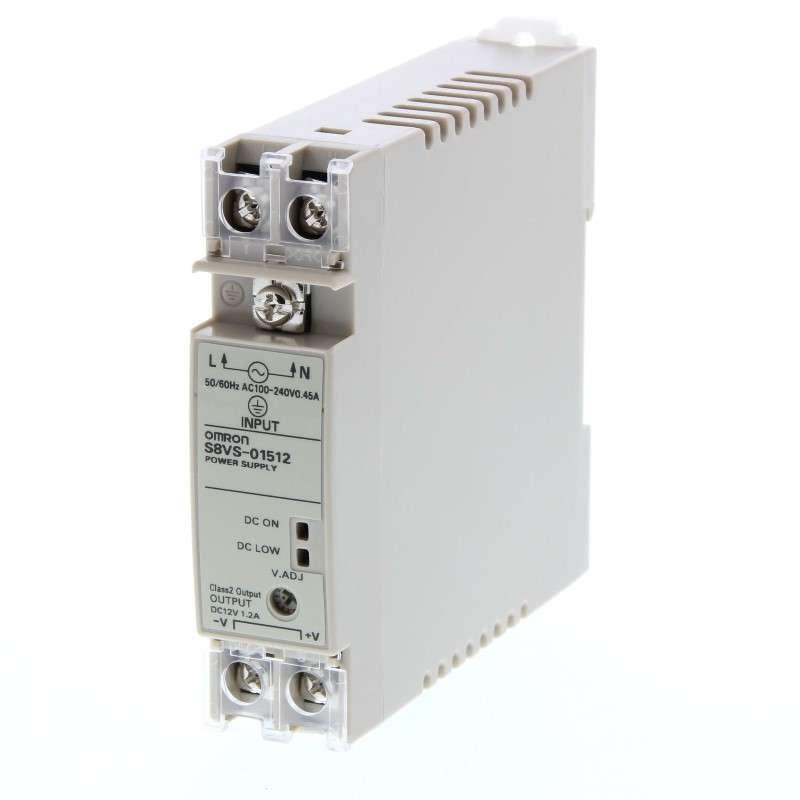 S8VS-01512; Power supply, plastic case, 22.5 mm wide DIN rail or direct panel mounting, 100/240 VAC supply, 15 W, 12 VDC, 1.2 A output